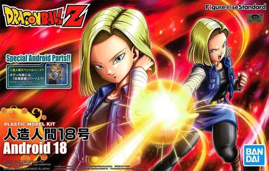 El kit incluye articulación en varias zonas del cuerpo, lo que facilita crear poses expresivas una vez ensamblado. También se usan materiales firmes que aseguran estabilidad y resistencia, manteniendo la forma del modelo con claridad. Por otro lado, el diseño del atuendo y el cabello está dividido en piezas que aportan volumen y textura, reforzando la fidelidad al estilo clásico de la serie. Así, el conjunto se integra sin dificultad junto a otras maquetas de la línea Figure-rise Standard o figuras de Dragon Ball Z. Su tamaño de 18 cm ofrece una presencia cómoda y fácil de exponer. Finalmente, su estética cuidada convierte a Android 18 en una pieza ideal para quienes buscan una maqueta moderna y bien definida.