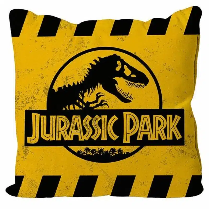 Cojín Jurassic Park 40×40 cm con diseño oficial estilo Caution. Perfecto para decoración friki y fans de la saga.