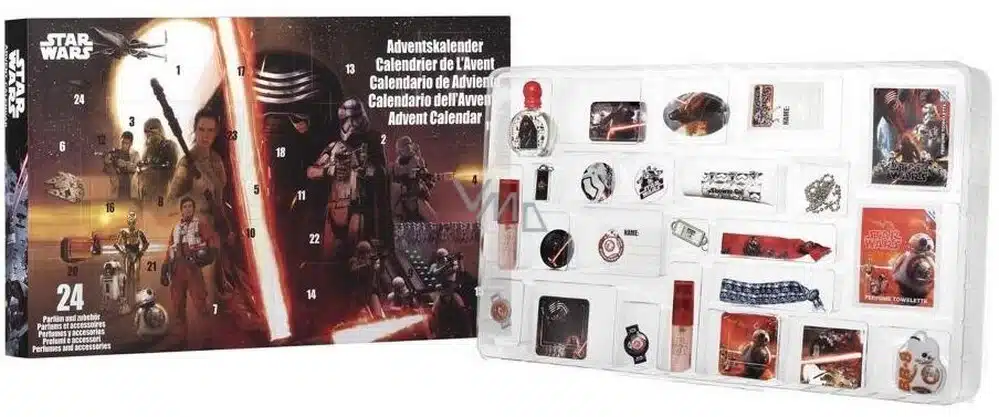 Calendario de Adviento Star Wars con 24 perfumes, accesorios y sorpresas temáticas. Perfecto para regalos navideños y fans del universo galáctico.