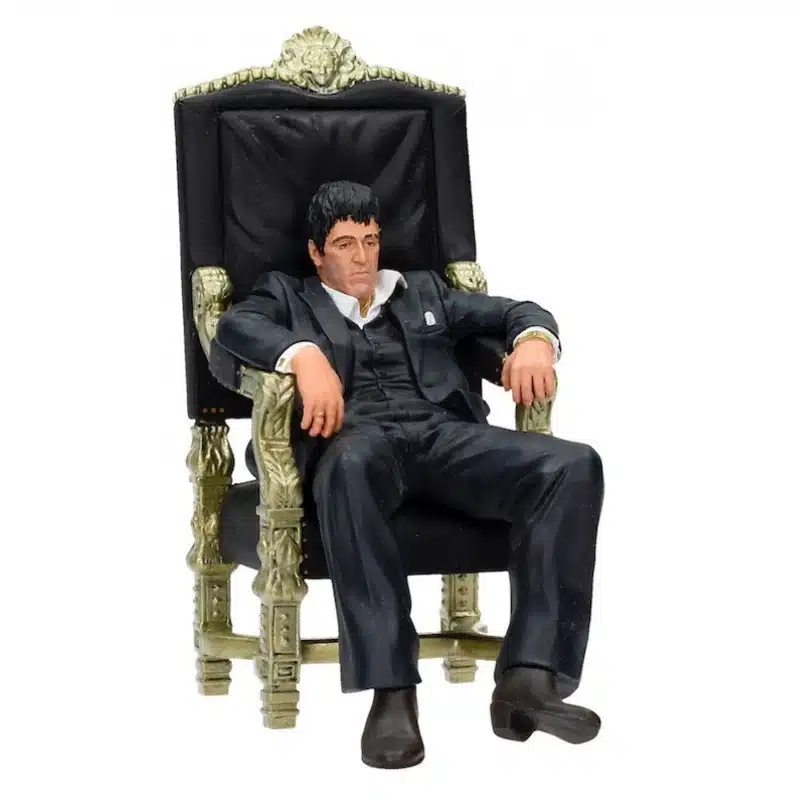 Fabricada por SD Toys en PVC bajo licencia oficial, esta figura pertenece a la línea Movie Icons, centrada en personajes memorables del cine. Los detalles en traje, reloj, textura del sillón y terminaciones aportan un aspecto fiel a la película, manteniendo una escala compacta que facilita su exposición. Está pensada tanto para coleccionistas de figuras cinematográficas como para fans de Scarface que buscan un objeto decorativo icónico, con estética reconocible al instante.